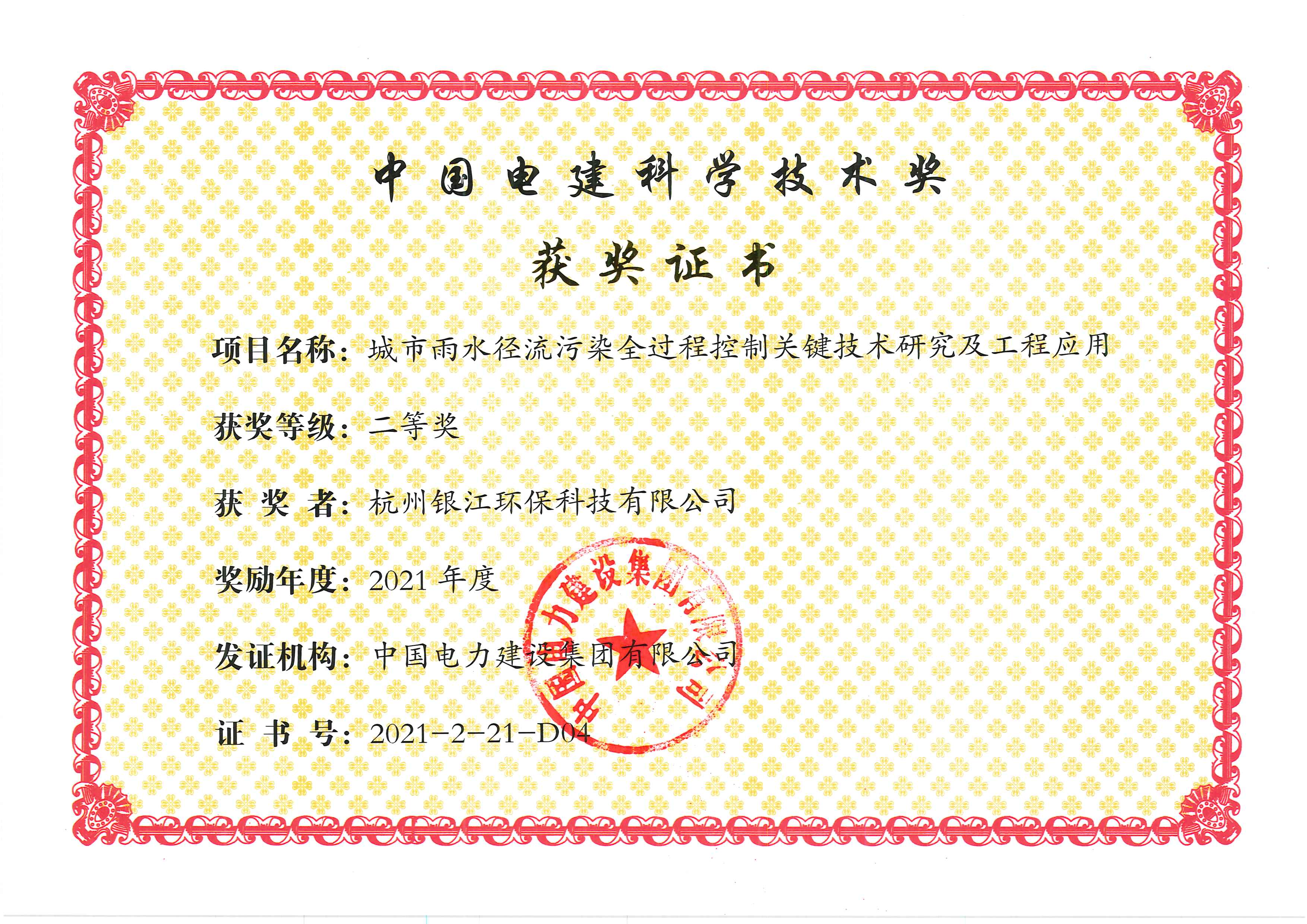銀江環(huán)保《城市雨水徑流污染全過(guò)程控制關(guān)鍵技術(shù)研究及工程應(yīng)用》獲中國(guó)電建科學(xué)技術(shù)二等獎(jiǎng)。