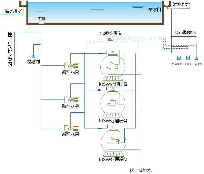 游泳池池水的循環過濾消毒就是其水處理工藝流程,游泳池池水處理的特點是循環過濾,其設計要點是循環水流量和循環周期問題,還有給水口、回水口的分布以使均勻布水問題,死水區和短流的問題。