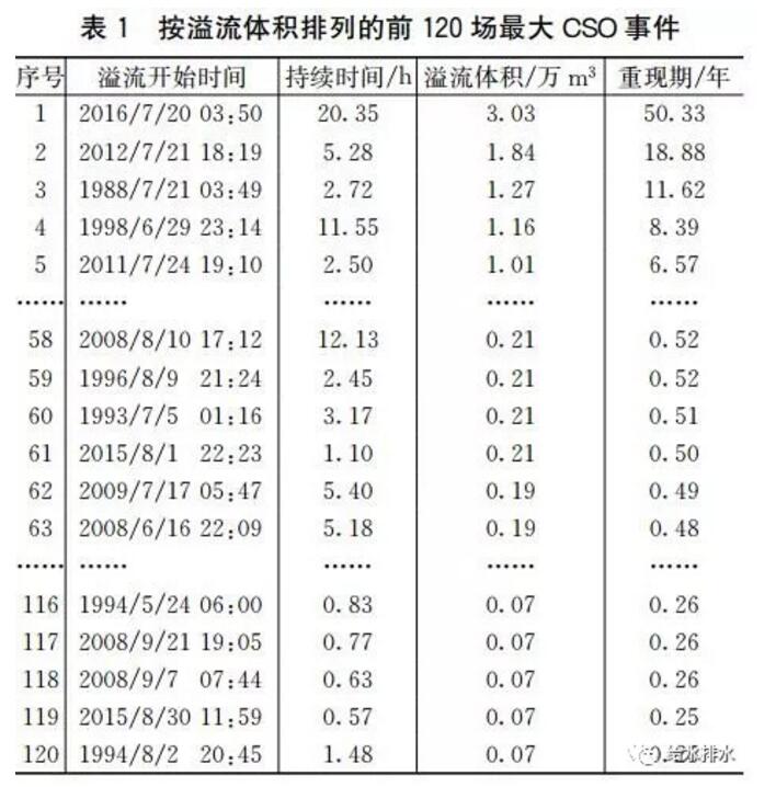 按照溢流體積從大到小將CSO事件進行降序排列,并選取前N場最大CSO事件,N=βm,其中,β為每年選取CSO事件的個數,按年多個樣法,本案例β取值為4,m為模擬年數30年。每場CSO事件溢流體積對應的重現期T=(m+1-2α)/(i-α)[9],其中i為CSO事件按溢流體積從大到小排列的序號,α為權重因子,取04,計算結果如表1所示,其中,重現期T也可根據式T=(mβ+1)/iβ計算。