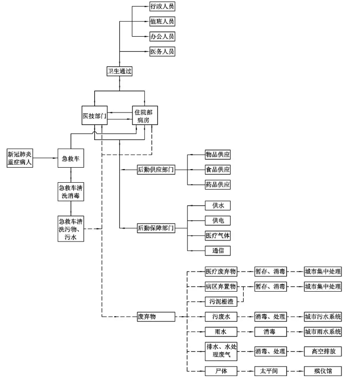 火神山醫院基本流程(見圖2)進行了合理劃分,醫技與住院部充分考慮了清晰的潔污、醫患、人車等流線組織,避免院內感染。醫療廢棄物、污物、污水、雨水與廢氣等均得到妥善處置,可以避免生物安全隱患產生。