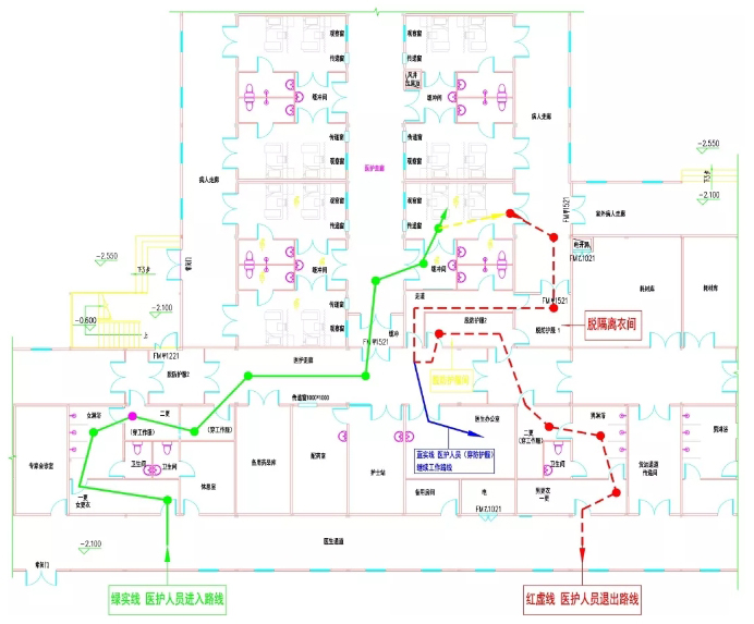火神山醫院醫療設施按傳染病醫療流程進行布局,且根據新型冠狀病毒感染的肺炎傳染病治療流程進一步細化功能分區。基本分區為清潔區、限制區(半清潔區)、隔離區(半污染區和污染區),相鄰區域之間設置相應的衛生通過或緩沖間。醫護人員進入及退出流線如圖3所示。