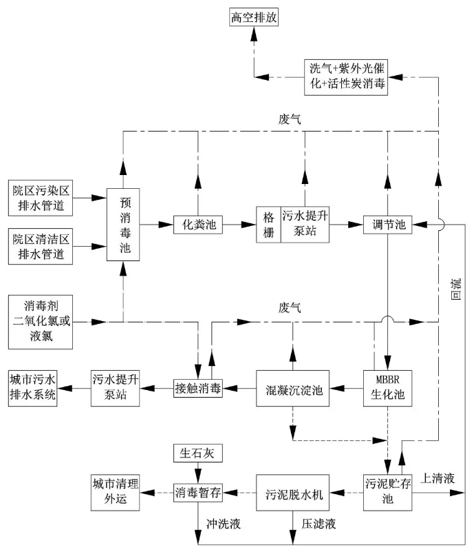 雖然消毒工藝投加較多的含氯消毒劑,將會對后續污水處理站的生化處理帶來不利影響,但還有最重要的一點,項目要求在10天內完成施工交付,建設工期超短,且處于春節長假期間,施工單位能采買到的設備和材料受到極大的限制,這在很大程度上左右了工藝的選擇,所以預消毒工藝沒有選擇臭氧消毒劑。