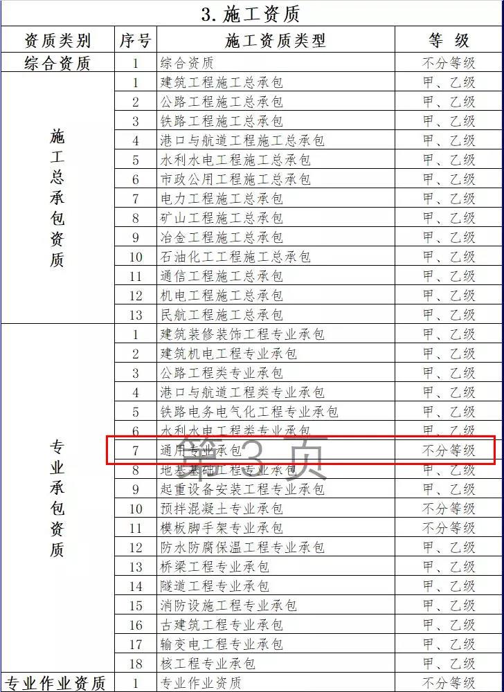 3.施工資質。將10類施工總承包企業特級資質調整為施工綜合資質,可承擔各行業、各等級施工總承包業務;保留12類施工總承包資質,將民航工程的專業承包資質整合為施工總承包資質;將36類專業承包資質整合為18類;將施工勞務企業資質改為專業作業資質,由審批制改為備案制。綜合資質和專業作業資質不分等級;施工總承包資質、專業承包資質等級原則上壓減為甲、乙兩級(部分專業承包資質不分等級),其中,施工總承包甲級資質在本行業內承攬業務規模不受限制。