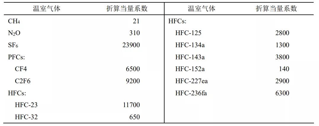 溫室氣體釋放量指處理單位水量或去除單位質量污染物所釋放的溫室氣體量。污水再生處理過程釋放的溫室氣體主要包括二氧化碳(CO2)、甲烷(CH4)、氧化亞氮(N2O)、氫氟碳化合物(HFCs)、全氟碳化合物(PFCs)和六氟化硫(SF6)等。溫室氣體與CO2轉化的當量系數,參見表2。環境指標的具體計算公式可參見標準正文。