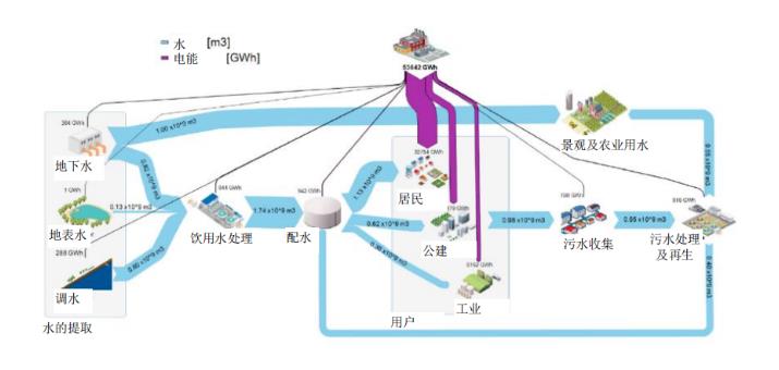 圖2所示給出了北京2015年水系統(tǒng)水量與能耗分配關(guān)系桑基圖,可以評(píng)估城市“水足跡”過程及能量消耗,在城市尺度上系統(tǒng)評(píng)估和多目標(biāo)優(yōu)化“水-能”關(guān)系,通過水系統(tǒng)全流程過程系統(tǒng)規(guī)劃、聚焦水循環(huán)每個(gè)鏈條,進(jìn)行傳統(tǒng)工藝改進(jìn)、高效設(shè)備及革新性工藝技術(shù)應(yīng)用,尤其是對(duì)排水系統(tǒng)結(jié)構(gòu)優(yōu)化進(jìn)而提升系統(tǒng)能源利用效率,因地制宜地采用污水中資源、能量回收以及清潔能源提取和利用等技術(shù)措施,進(jìn)一步降低水系統(tǒng)能耗和溫室氣體排放,對(duì)于提升水系統(tǒng)韌性及可持續(xù)至關(guān)重要。