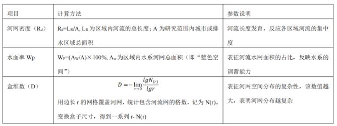 河網(wǎng)調(diào)蓄能力是水系在水文方面的重要功能之一,尤其在削減洪峰、降低洪水危害中具有重要的作用。受人類活動(dòng)影響,尤其是近半個(gè)世紀(jì)年以來快速城鎮(zhèn)化引起的土地利用方式變化,致使許多城區(qū)河流、水塘、水淀區(qū)被掩埋甚至完全消失,導(dǎo)致城市水面率大幅減少,河網(wǎng)、水系發(fā)育及演變也表現(xiàn)出由復(fù)雜到簡(jiǎn)單、由多元到單一的變化趨勢(shì)。世界范圍內(nèi)60%以上的河流受到城市化的影響,而城市化對(duì)河流生態(tài)完整性及生態(tài)功能造成了嚴(yán)重威脅;從國(guó)內(nèi)外經(jīng)驗(yàn)看,這種演變無疑還會(huì)加劇洪澇災(zāi)害、水質(zhì)惡化等問題。借助河道容蓄指標(biāo)與水系結(jié)構(gòu)參數(shù)的相關(guān)關(guān)系分析河網(wǎng)結(jié)構(gòu)對(duì)調(diào)蓄能力的影響,常用的水系變化指標(biāo)包括數(shù)量特征參數(shù)和復(fù)雜性參數(shù),選取河網(wǎng)密度(Rd)、水面率(WP)描述水系的數(shù)量特征,河網(wǎng)盒維數(shù)描述水系的復(fù)雜性特征,各指標(biāo)計(jì)算方法及內(nèi)涵見表1。