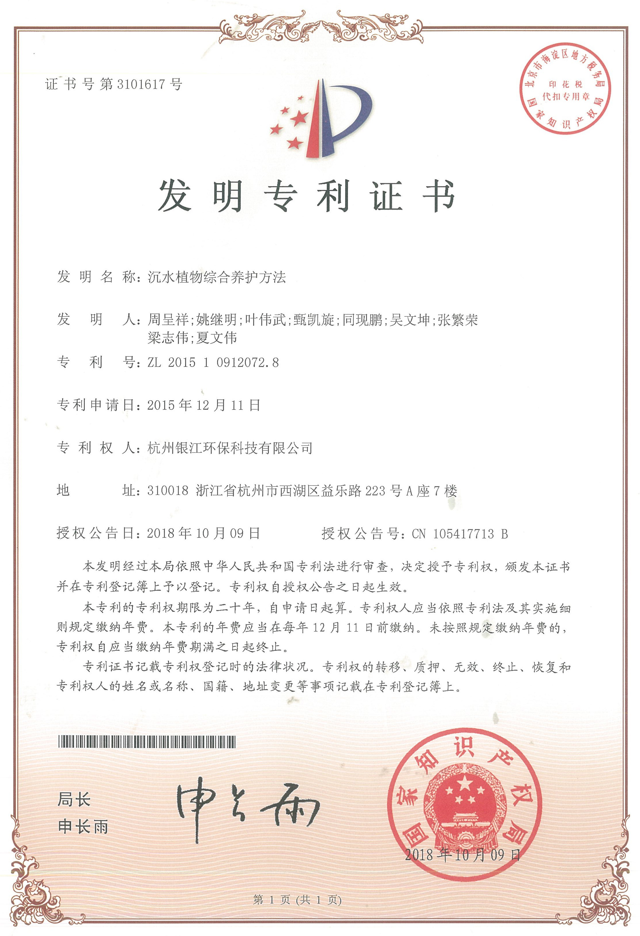 近日,杭州銀江環保科技有限公司再次獲一項發明專利:沉水植物綜合養護方法(專利號ZL 201510912072.8)。