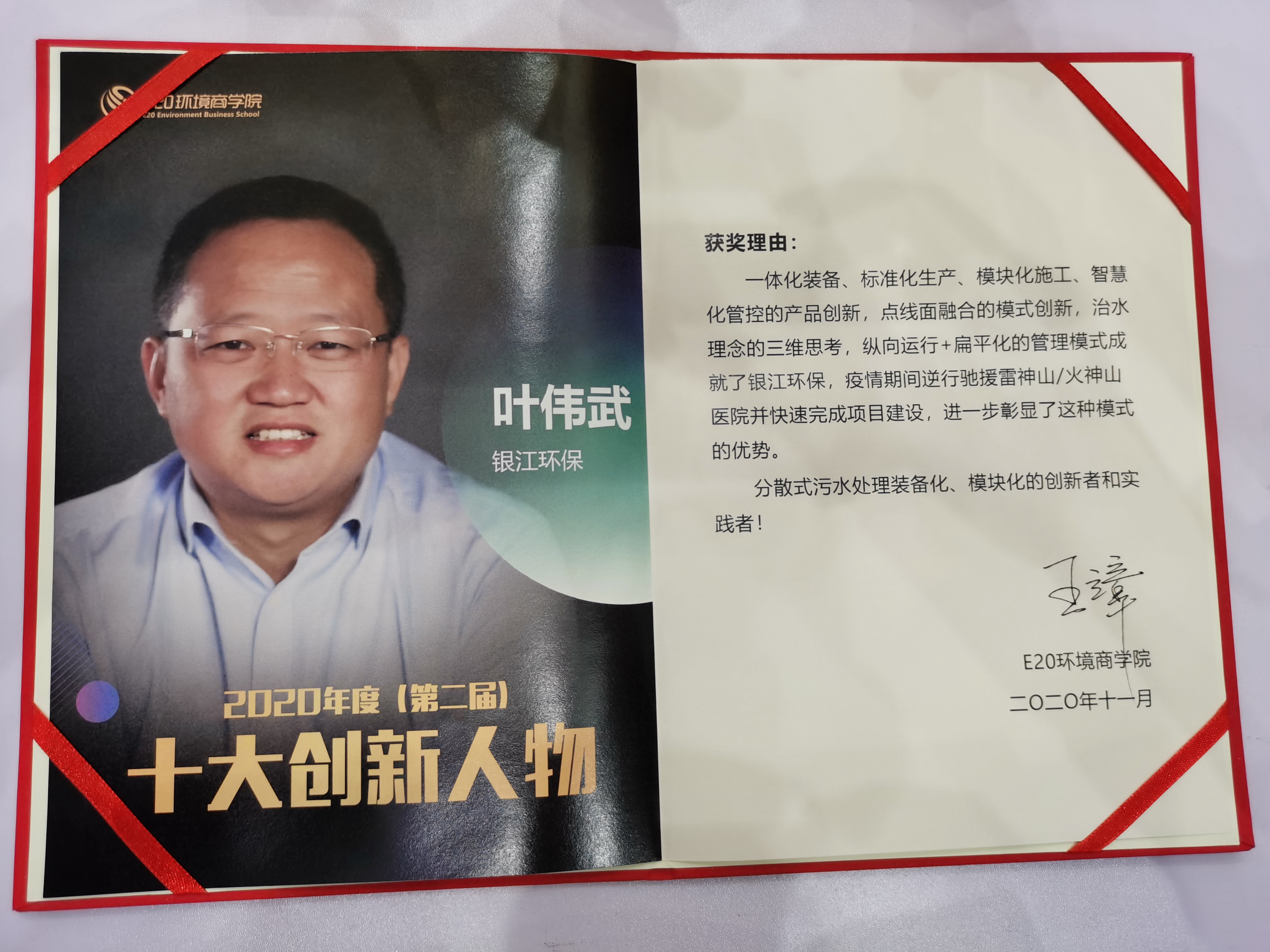 感恩年會上進(jìn)行了E20環(huán)境商學(xué)院2020年度(第二屆)創(chuàng)新人物榜單揭曉與頒獎。銀江環(huán)保董事長葉偉武憑借“產(chǎn)品創(chuàng)新、模式創(chuàng)新”贏取超高人氣,現(xiàn)場捧回“十大創(chuàng)新人物”、“創(chuàng)新分享獎”、“最佳人氣獎”三大獎項。